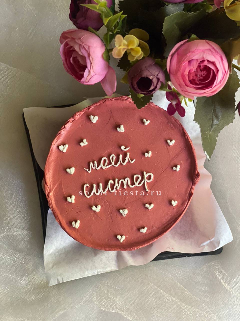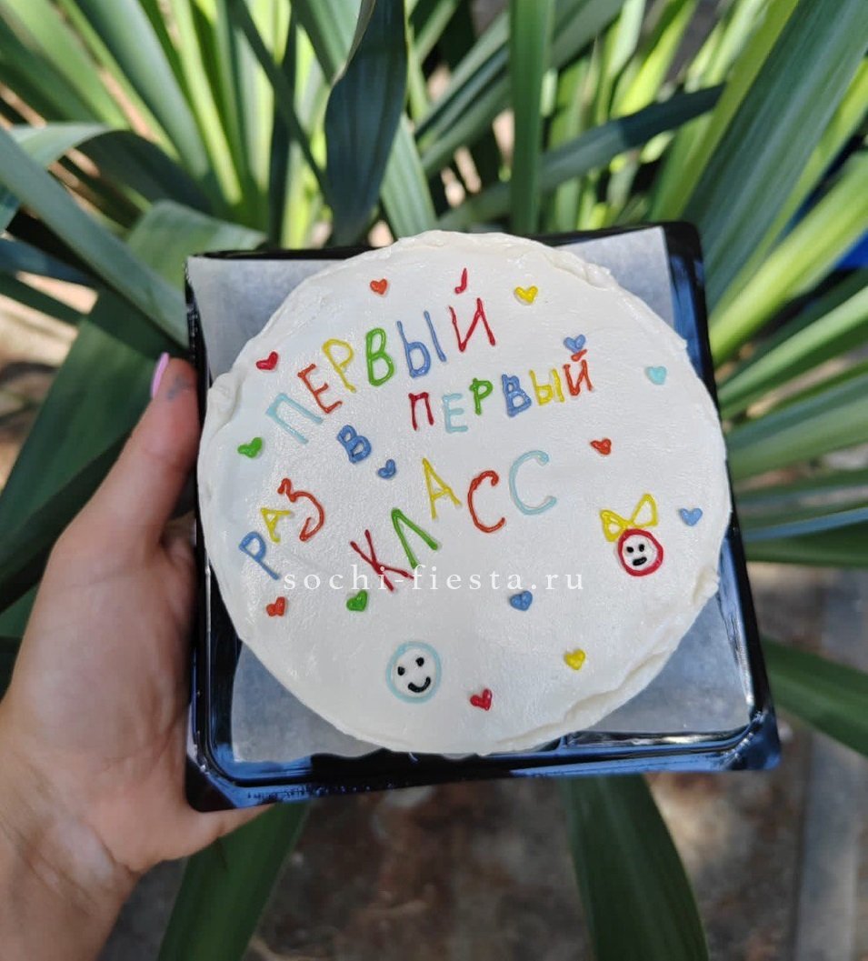 Миниатюрный торт с яркой надписью и домашним теплом в каждом слое. Крем держит форму, а бисквит остается влажным благодаря небольшому объему и свежести выпечки.