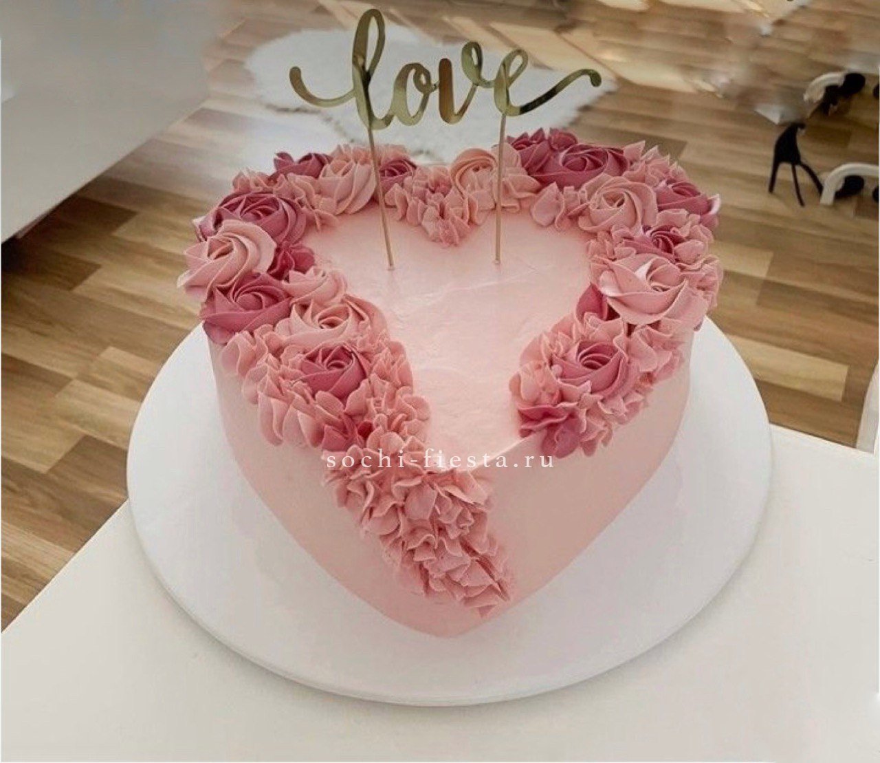 Форма сердца задает романтичное настроение всему столу. Дизайнерское исполнение и ручная работа делают этот торт запоминающимся акцентом праздника. Весит полтора килограмма и больше.