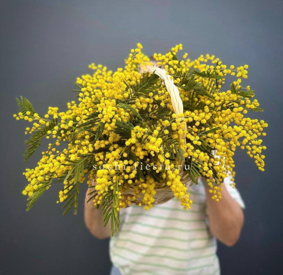 Солнечные шары мимозы собраны в пышную корзину. Яркий жёлтый цвет мгновенно поднимает настроение и напоминает о первых тёплых днях.